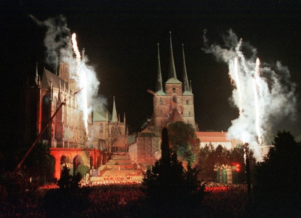 Dom und Severi-Kirche in Erfurt mit Feuerwerk
